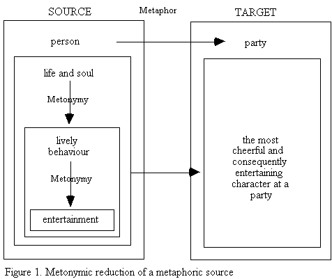 By way of illustration of the first possibility, take the expression He is the life and soul of the party ('the person who, by being lively and entertaining, will make the party more lively or cheerful'). In it a party is metaphorically seen as a person (who has life and a soul). The life and soul of a person stand metonymically for the person's lively behaviour. Then, there is one further metonymic mapping from lively behaviour to the ability to produce entertainment. In both metonymic mappings the target is a subdomain of the source: in the first one, a person's lively behaviour is seen as a consequence (and therefore as a subdomain) of the person's having 'life and soul', in the second one, it is the ability to entertain others that is a consequence (then, a subdomain) of the person being cheerful. Each of these metonymic mappings has the function of highlighting a relevant part of the domain to which they belong. In so doing, the metonymic mapping cues the central correspondence in the metaphoric mapping and consequently the most central explicature.