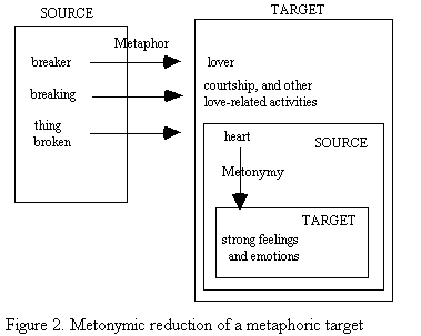 In this case, the metonymy is one of source-target inclusion and serves the purpose of providing all the conceptual material for the metaphoric mapping to develop the central explicature.