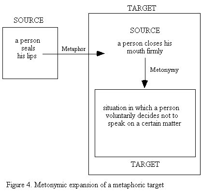 The division between source-in-target and target-in-source metonymies has important consequences for cases of interaction between metaphor and metonymy. There are two interactional possibilities: one, in which the output of a metaphoric mapping provides the source for a metonymy, and another in which a metonymic mapping provides the source for a metaphor[xii] . In both cases, the metonymy works either inside the source or the target of the metaphoric mapping but with different purposes, as will become evident below.